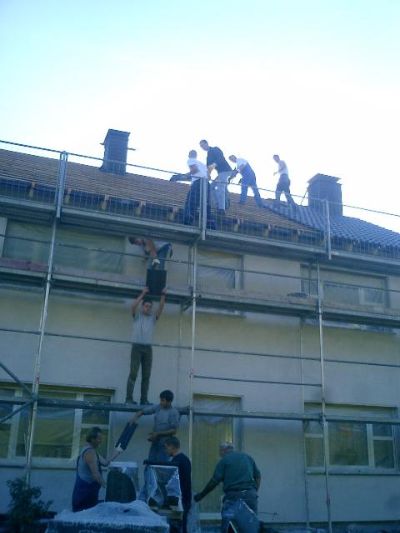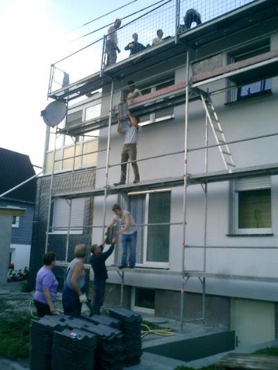 Team 2: Latten drauf!! Team 3: 750 Pfannen a 80ger Frontladerschaufelpakete nach hinters Haus!! Team 4: (hinter mittlerem Fenster oben) Kuchen backen!!!