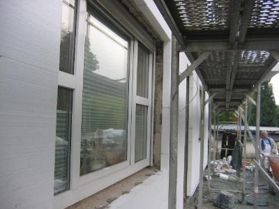 Fensterumrandung in Fenstergrau angestrichen, Fallrohr befestigt, Rollos gewaschen und schon kann das Gerüst weg!!